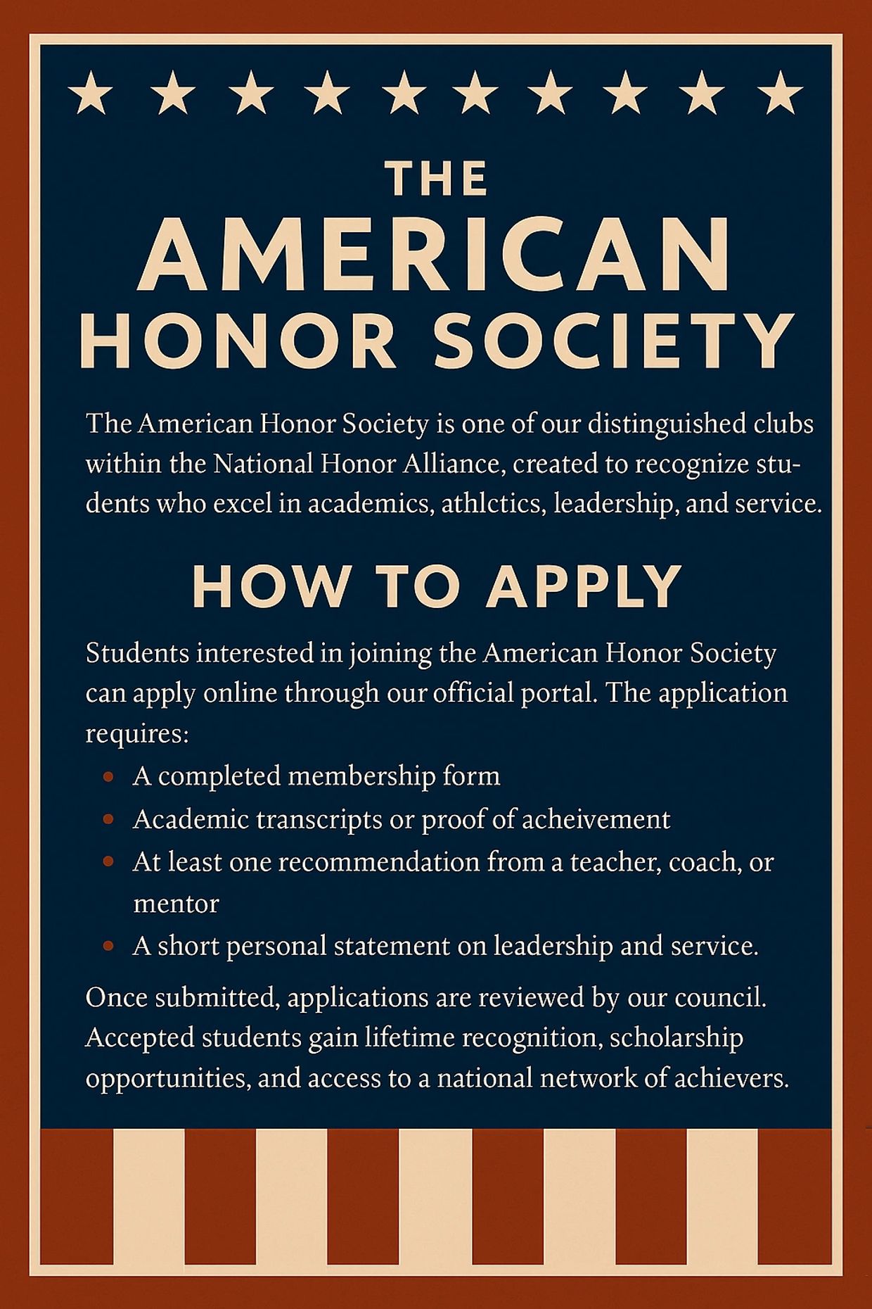The American Honor Society is one of our distinguished clubs within the National Honor Alliance, created to recognize students who excel in academics, athletics, leadership, and service. Membership in the Society represents a commitment to integrity, scholarship, and community impact—values that prepare students for future success.