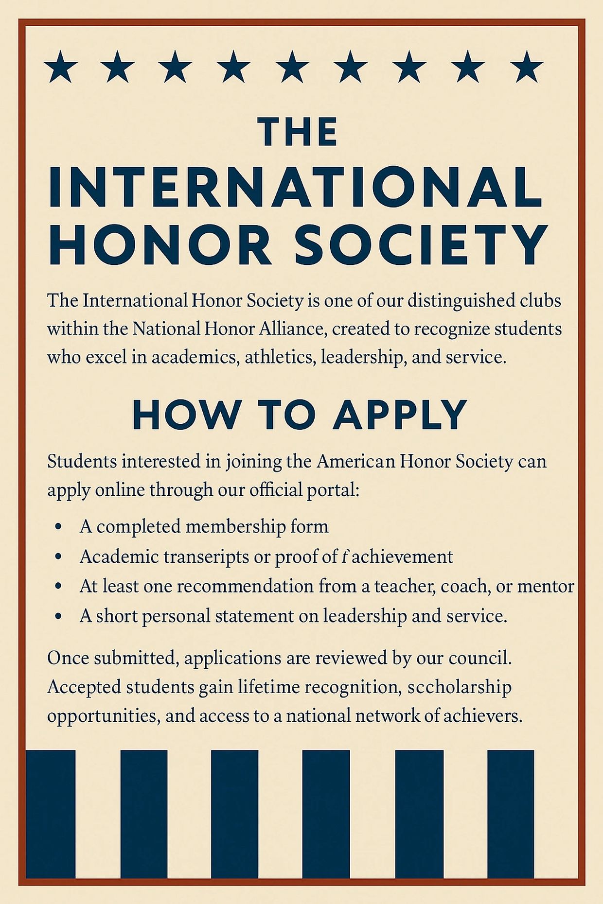The International Honor Society is one of our distinguished clubs within the National Honor Alliance, created to recognize students who excel in academics, athletics, leadership, and service. Membership in the Society represents a commitment to integrity, scholarship, and community impact—values that prepare students for future success.